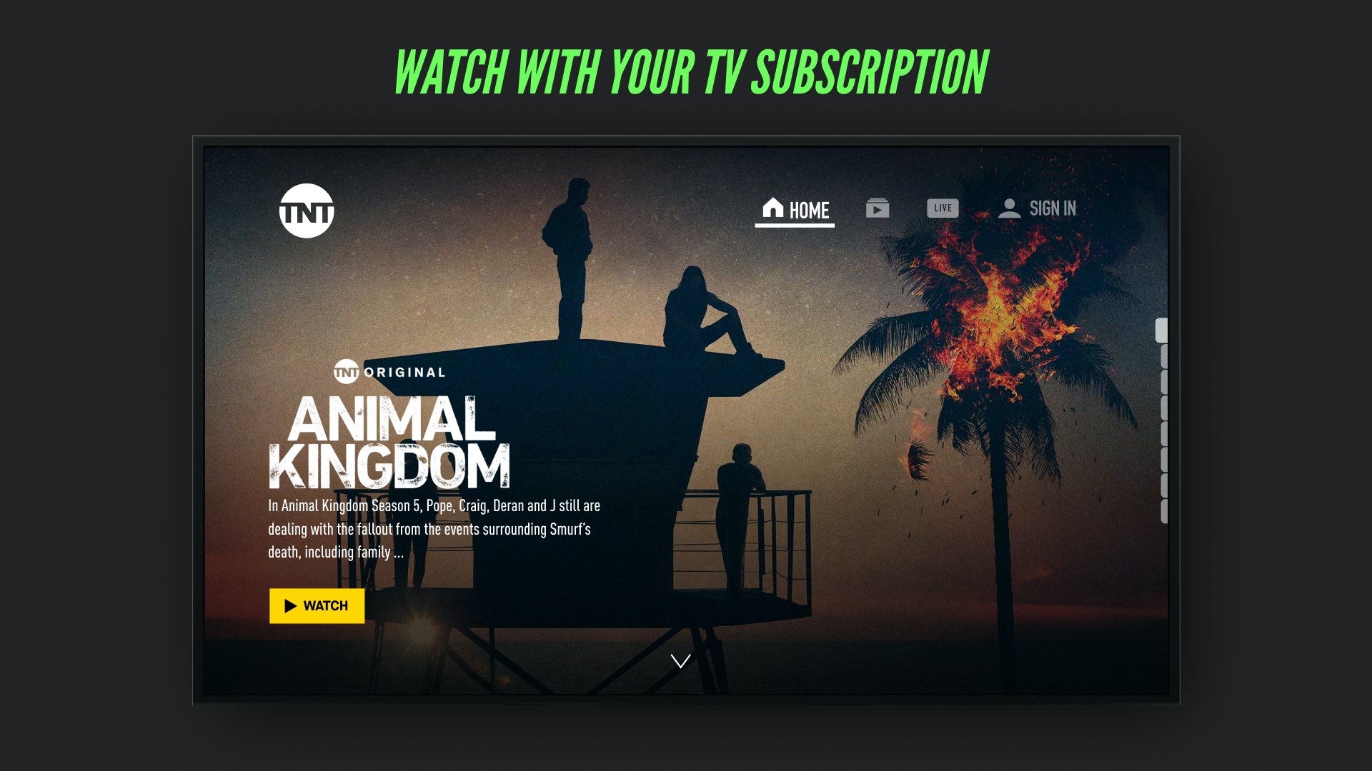 Watch MLB and full episodes of TBS originals like MIracle Workers. You can also catch live sports with NBA on TNT AEW on TNT awards-shows with the SAG Awards blockbuster movies on any screen. The TNT app makes watching movies full episodes and live sports easy.